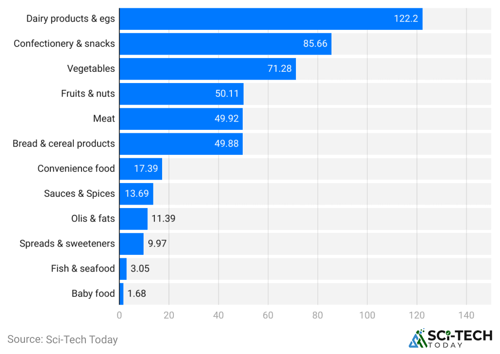 As of 2023, the highest per capita consumption of food products in the United States by type is for dairy products and eggs, resulting in 122.2 kilograms, followed by Confectionery and snacks and vegetables at 85.66 kilograms and 71.28 kilograms, respectively. Other food products followed in the list are fruits and nuts (50.11), meat (49.92), Bread and cereal products (49.88), convenience foods (17.39), sauces and spices (13.69), oils and fats (11.39), Spreads and sweeteners (9.97), Fish and seafood (3.05,) and baby food (1.68).