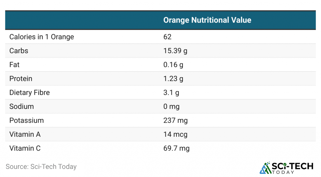 Orange Nutrition Facts: Oranges are among the most widely consumed fruits globally, valued for their vibrant color, juiciness, and rich nutrient profile. A medium-sized orange, weighing approximately 140 grams, provides 60 to 73 calories, depending on the variety. This serving offers 1.3 grams of protein, 14.8 to 16.5 grams of carbohydrates, 2.8 grams of dietary fiber, and minimal fat content at 0.2 grams.