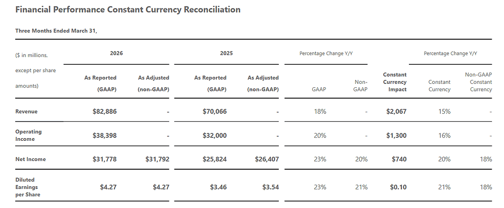| Microsoft (MSFT) | $82.9B | $70.1B | 18% | $31.78B | $25.82B | 23% |