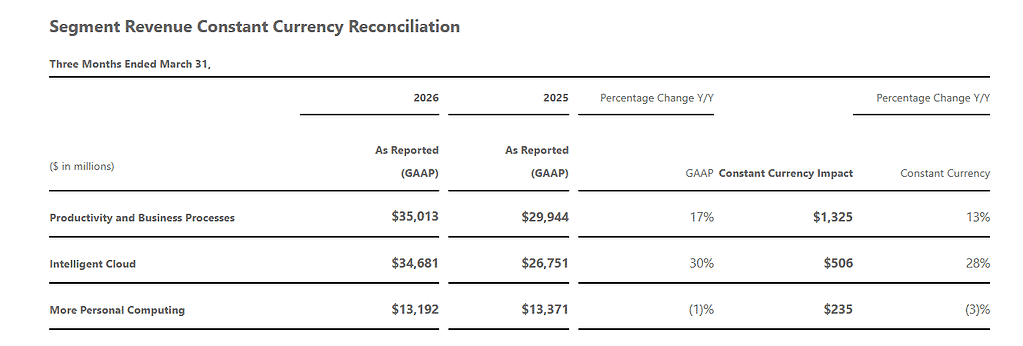| Productivity & Business Processes | $35.01B | $34.43B | Beat by ~$0.58B |