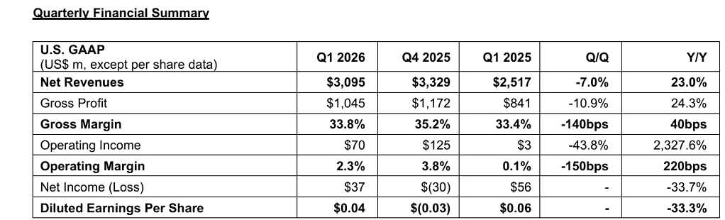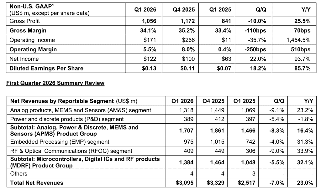 - Q1 2026 net revenues were $3.10 billion, an increase of 23.0% year over year; excluding the acquired NXP MEMS sensor business, revenues rose 21.4%.