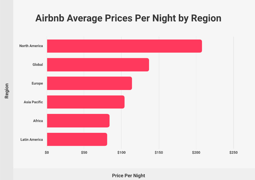 - The median cost for an Airbnb in North America is almost USD 163 per night.