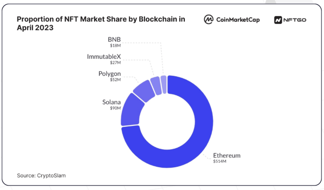 - As of April 2023, the top two trading volumes of NFTs are Ethereum, which accounted for USD 514 million and held a market volume share of 70%; Solana made up USD 90 million (12%), and Polygon with USD 52 million, with 7% market volume.