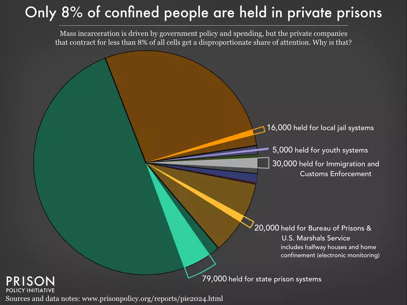 - As elaborated in Prison Statistics, in the U.S., only 8% of confined people will be held in private prisons in 2024.