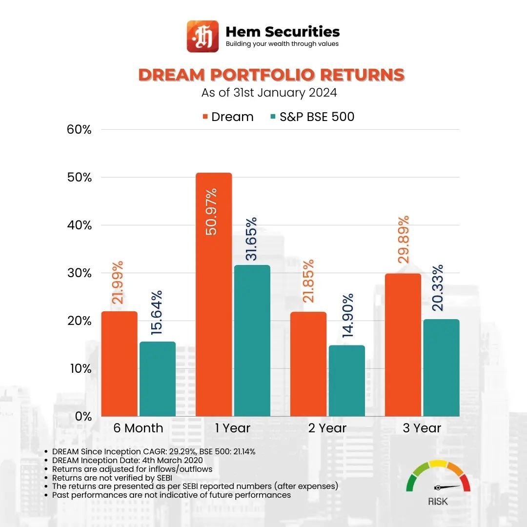 - The Dream, since its inception, has a 29.29% CAGR and a BSE 500 of 21.14%.
